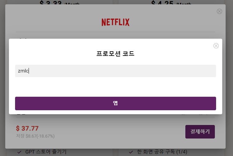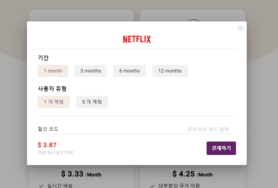 넷플릭스 스탠더드가 13,500원이지만 여기서는 5363원으로 반값보다 싸게 이용하며