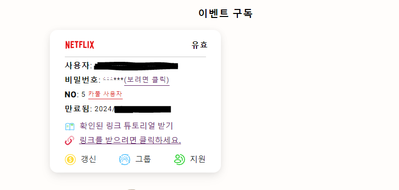 종류에는 NETFLIX, Disney Plus, Spotify, Youtube Premium, GPT Plus, Paramount, crunchyroll, TIDAL, MT-GPT가 있습니다.