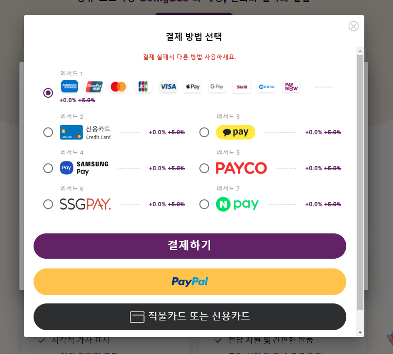 결제할 수 있는 방법이 애플페이, 삼성페이, 카카오페이, 쓱 페이, 네이버페이등 다양하여 쉽게 결제할 수 있습니다.